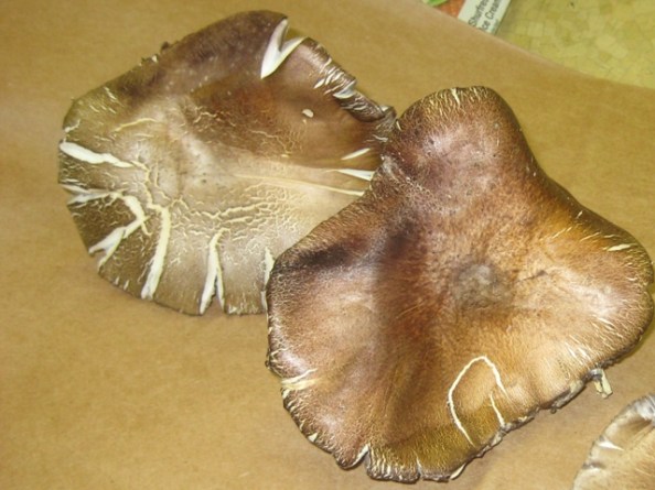 One day last week a shy, retiring gentleman–OK, a guy who does not like to have his picture taken–brought Kathy Windiate a nice offering of his fine cultivated Wine Cap Mushrooms (Stopharia rugosa-annulata). I thought you’d like to see them. They were enormous.