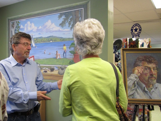 Last weekend Chris and Sonny had a Reception to Meet the Artist at the Torch Lake Market. They were honoring muralist Dennis Orlowski, who created the delightful Window on Torch Lake right where I can look at it when I am having breakfast. Here’s Dennis telling Loraine Mottern all about it.