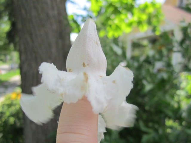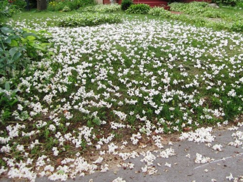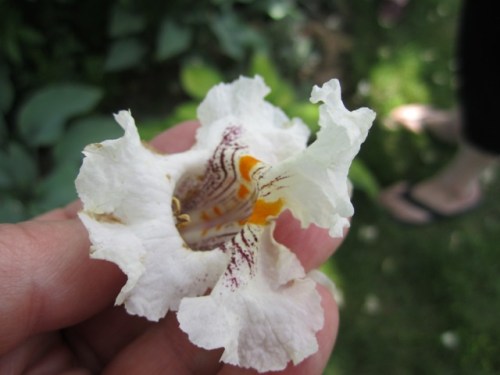 As it happens, I do know the name of the tree. It is a Catalpa (a/k/a Catawba). In fact, according to my Trees of Michigan Field Guide by the estimable Stan Tekiela, it is a Northern Catalpa (Catalpa speciosa). More important, according to Louan and Joanne, it’s the name of the tree that grows in Joanne’s yard and drops its frilly orchids all over her lawn at this time of year. Looky here–snow in June!