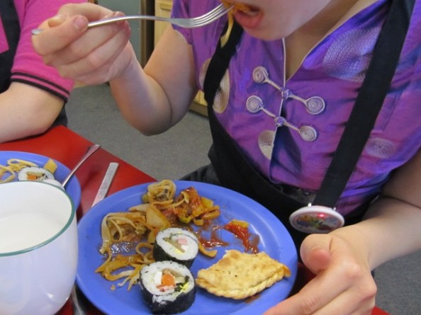 So then I made everybody pose for a Thanksgiving Picture, and I got most everyone in but not quite.  I’m pretty sure they’re all in the second slideshow at Torch Lake Township meets Mongolian cuisine (where you will also see all the delectable dishes in full glory).  Now here’s the thing I want you to notice especially.  Odi and Crystal, exquisite cooks that they are, think that ketchup is a perfect complement to Mongolian cuisine.