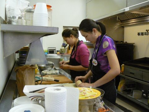 That’s Crystal in pink Mongolian cashmere and Odi in purple Mongolian silk–with an iPod attached to her ear.  I was completely absorbed in the preparations. I also managed to score some early samples. Someone, after all, has to be a taste tester.
