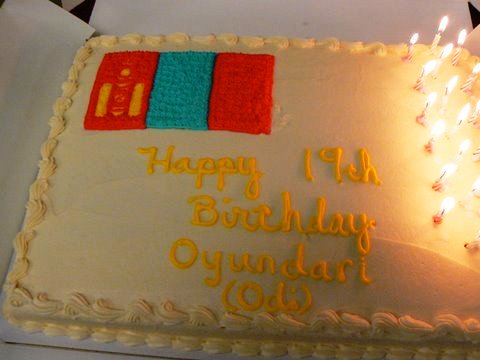 In the morning there was a chocolate birthday cake decorated with a Mongolian flag, made by Chris’s niece. (That’s the Soyombo symbol on the flag, and the link will explain it to you much better than I can.) Customers had cake with breakfast, cake with coffee, cake with lunch . . . Americans are inexplicable.  Nice, though.