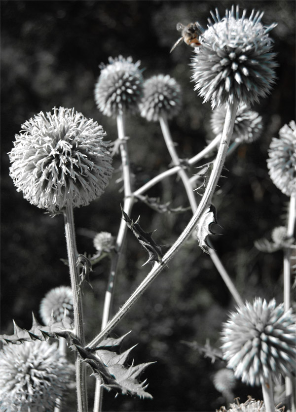 This has been driving me nuts since then–OK, someone I used to know said that was a pretty short trip–but I think I finally found an ID. It’s Echinops, a cultivated plant related to thistles, and often called Globe Thistle. There are a gazillion varieties, and I dont’ know which this is for sure, but I’m betting on Echinops exaltatus.