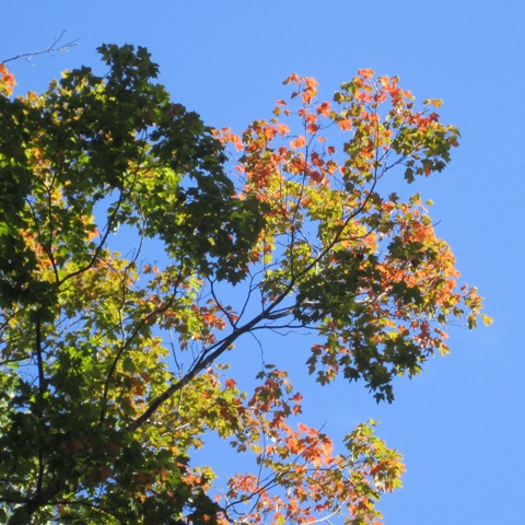‘Morning, Miss Amy-Lynn. The leaves aren’t really turning here either, except for the very tips of the maples, and the occasional shrubby underbrush. But it’s always this way. Always in August we say, It’s only August and the leaves are turning! But it’s like that first gray hair that shows up when you’re in your thirties. Just a little harbinger. The Big Show comes later.