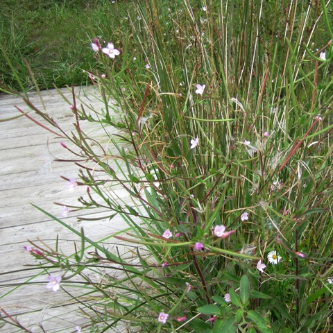 I have it narrowed down to two possibilities: American Willowherb (Epilobium ciliatum) and Marsh Willowherb (Epilobium palustre). You can compare them at Nature Notes and see more E. ciliatum at Skye Flora: American Willowherb. Keep in mind that those sites are in the UK and “introduced” there might well be something “native” here. The whole invasive species thing is pretty confusing when you start thinking it through.