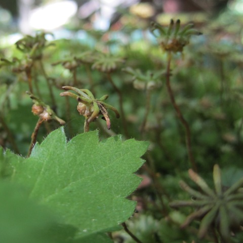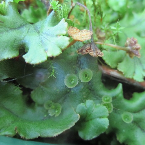 Meanwhile, over in Tiny World, seeds dropped off by obliging birds have grown into Giant Invaders. I have no idea what they will become. The leaves and stems are downy, if that tells you anything. Underneath the alien canopy, the liverwort garden is doing just fine. Liverworts are exceedingly adaptable, and do not seem to trouble themselves overmuch about the issue of invasive species.