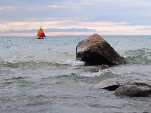 I swear, a person does not need television around here.  Yesterday we were taking a brisk walk along the shore.  A storm was brooding over the Leelanau Peninsula and we wanted to be snugly back home before it hit.  I heard shouting, and saw a tiny boat out there at the sandbar.  What the heck, I thought.  The sailors (I use the word loosely) could just jump in the water and practically wade ashore from there, towing their tiny craft with them.  The farthest they’d have to swim would be maybe 50 feet.  Were they really calling for help?