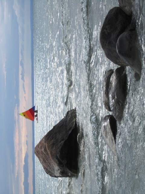 No.  They were having an extended conversation amongst themselves about strategy.  Eventually, a couple of guys took the plunge, lightening the load so that the others could sail back to shore farther on down. I chatted briefly with the waders as they made their way south along the beach, but took no photos of them. They were in a good mood, mind you, but were not really picturesque.