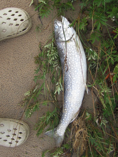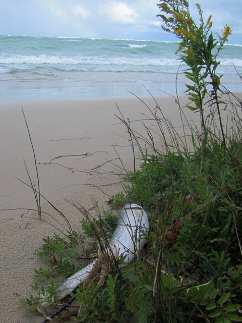 This morning there are signs everywhere of the storm passing. Branches pulled from trees, leaves pulled from branches, and a fish pulled from the lake and dropped far up the beach.
