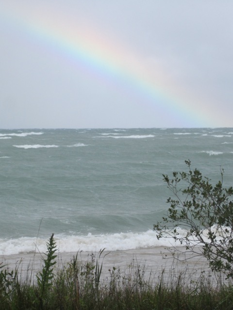 Sometimes, when you’re very lucky, you can see the whole rainbow from end to end. One time–this was one of those peak experiences–I was driving home as a light summer rain ended and was treated to a triple rainbow, end to end, spread across the sky over Central Lake. I did not have a camera with me, but I will never forget what it was like to drive through a rainbow. It was as if a bowl of butterscotch and rosy candies had vaporized. Finally, of course, drivers simply gave up, and pulled over to watch.