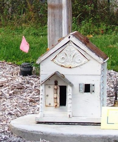 No, she did not find the house. She found its cunning building materials. Look closer. The doors and windows were made from old hinges. How cool is that? Now I’m thinking maybe I could buy some slightly larger used hinges someplace–maybe Deer Lake Junk!–and make a gate for the Duo’s playpen, a/k/a the deck.