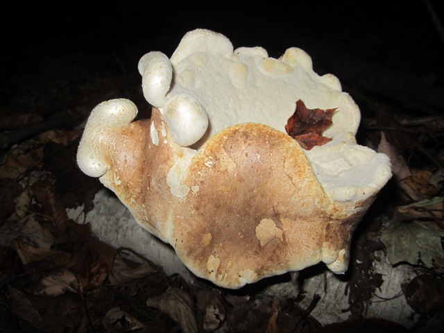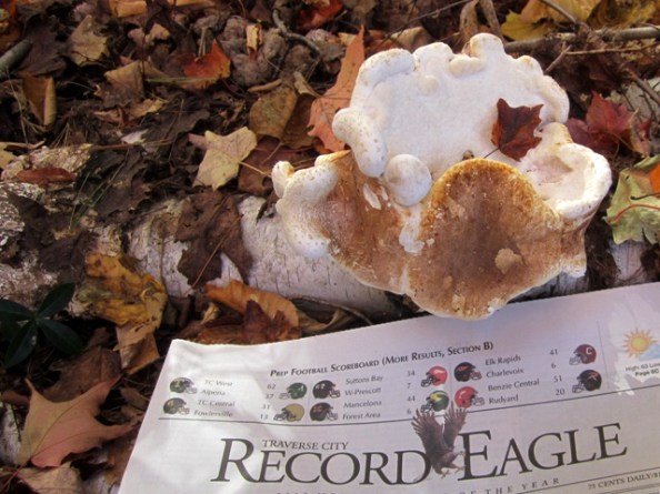 The Elks won the Big Game, and clinched at least a share of the Lake Michigan Conference title. Satisfactory. But I was not at the game. I was walking the dogs down on the beach and finding mushrooms in the woods at dusk. I know, I know, I said I was through with mushrooms for the season, but I had to show you this one. It looks exactly like toasted marshmallows, and it’s huge.