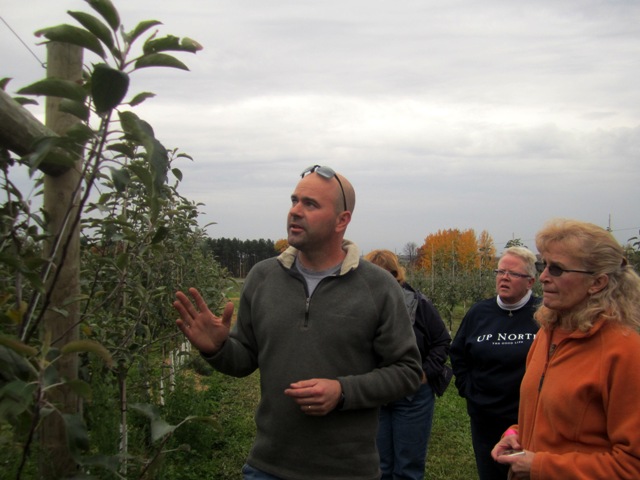 First stop Altonen Orchards, where we were greeted with apple wedges and toffee dip. I will give you the recipe. Then we set off on a hayride with Brian Altonen, a refreshingly youthful farmer. (The average age of farmers is 56. This is worrying on many levels, but we’re on the case, and that’s another post entirely.) We rode through rows of standard apple trees and then pulled up to examine the high density rows, where apples are cultivated on dwarfing stock. These trees produce fullsize fruit but mature faster and are easier and safer to pick than standard plantings.