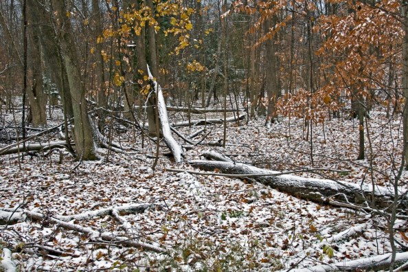 That’s what she says anyway. She wrote: We had a little snow this week. It’s gone now and it’s supposed to be close to 60º tomorrow. However I love snow and was happy to see this and I also liked the way the fallen trees worked their way back into the forest.