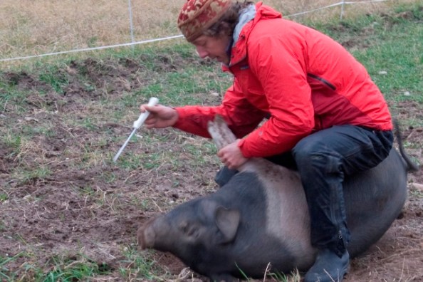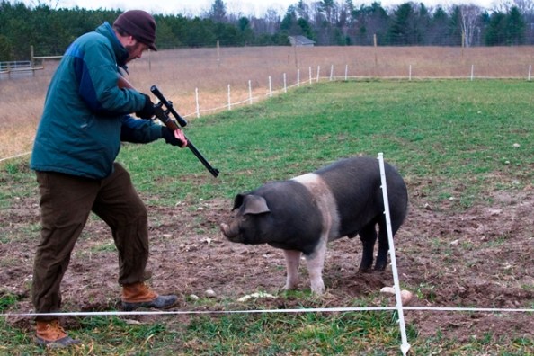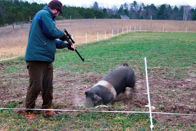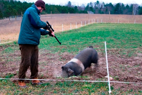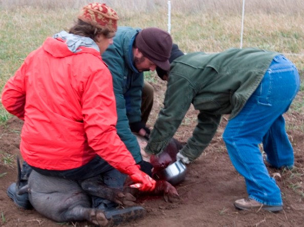 It got harder here. There isn’t any “instant” about dying. It took just under two minutes. There was a fierce pounding of hooves as the pig’s body fought to stay alive. No squealing. Just a sound like a herd of mustangs galloping, galloping across the prairie. Then it was over.