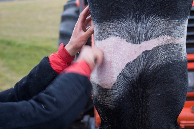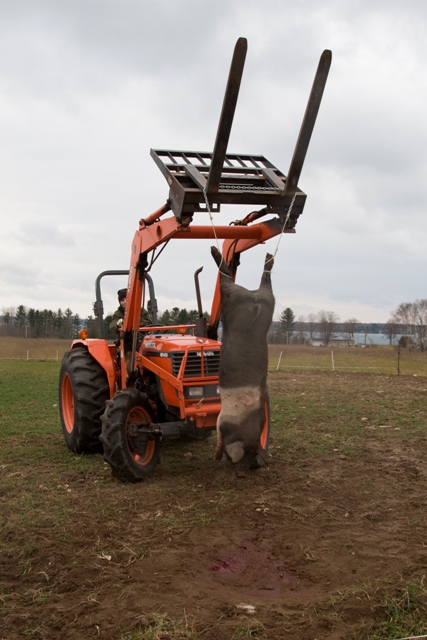 Jen brought the Kubota around, hoisted the pig up and trundled off to the space prepared for the cleaning.