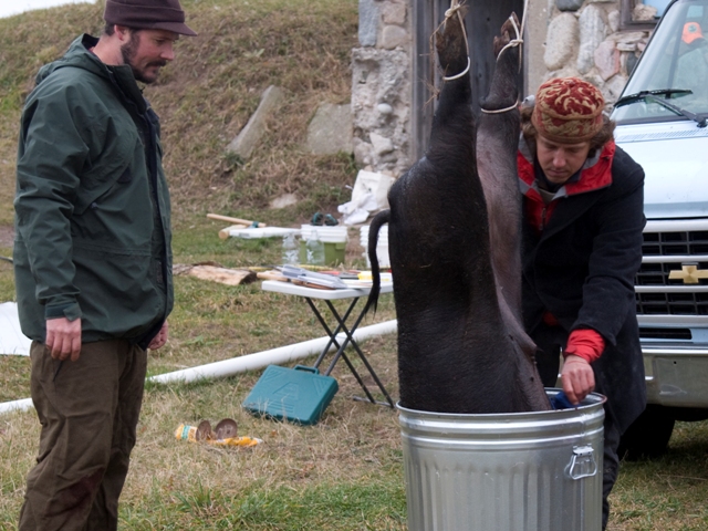 A clean trash can waited, filled with hot water. They hosed off the carcass and lowered it into the hot bath to loosen the hair.