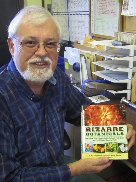 There is a lot more to learn about weird plants, and Larry Mellichamp, co-author (with Paula Gross) of Bizarre Botanicals, is just the fellow to explain it all for you.  He was puttering around at the greenhouse on a holiday weekend and agreed to sell me a copy of the book, which he inscribed.  I am having a very good time with it.  That is because I am not dipping into it for gardening advice.  No indeed, I am hunting weirdness.  You should expect nothing less from the person whose idea of gardening is watching the liverworts construct Tiny World.