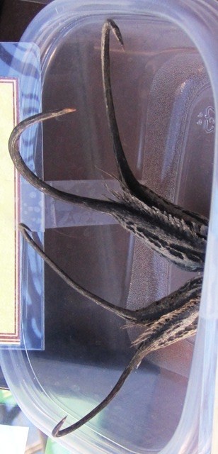 We were greeted at the greenhouse entrance by a little Tupperware tub of Devil’s Claw.  The stuff is fierce–it splits into long, curved thorns that latch onto the legs of deer and other animals, who broadcast the seeds as they run around trying to get rid of the thorns.  Imagine the Cowboy romping in a patch of that stuff.