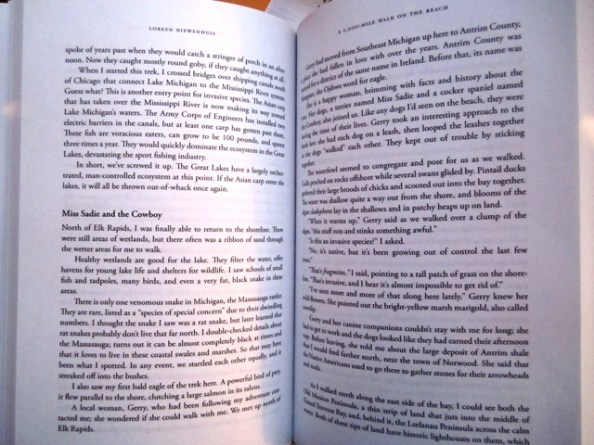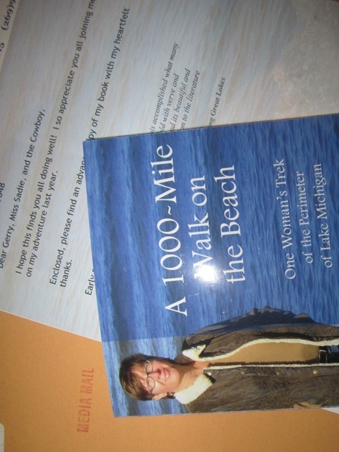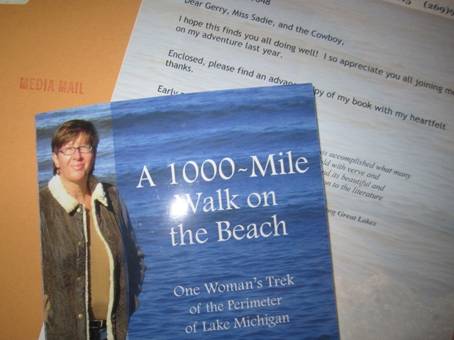 Miss Sadie and the Cowboy are feeling smug. Yesterday’s mail brought an exciting package from our friend Loreen Niewenhuis, stamped MEDIA MAIL. Inside was an advance copy of A 1000-Mile Walk on the Beach, the book Loreen wrote about her year-long trek around Lake Michigan.