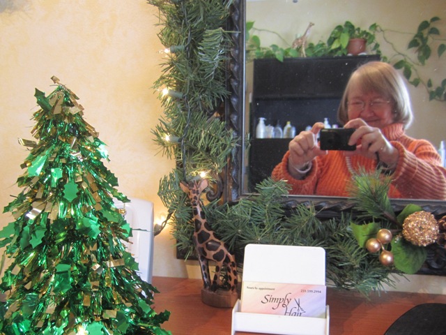 So anyway, there I was, getting all gorgeous and catching up on the news. I admired the holiday decorations at the salon. Barbara says a lot of her customers go away for Christmas and don’t bother to put up a tree. They enjoy hers instead.