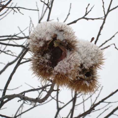Denied the opportunity to skylark around the Township looking for interesting bits of news, I rummaged around in the mulch pile. What to do, what to do. My world is swathed in gray flannel. Look at the poor chestnut burrs.