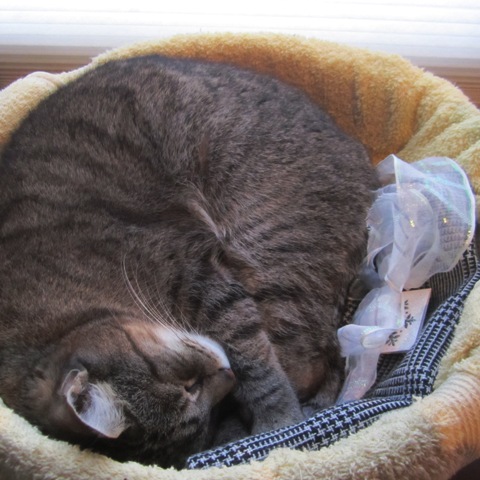 Miss Puss, however, is all warm fur and purr. She has been having a great deal of fun with her new toy: a sparkly ribbon from a holiday package. She’s taken to sleeping with it. You just never can tell about cats.
