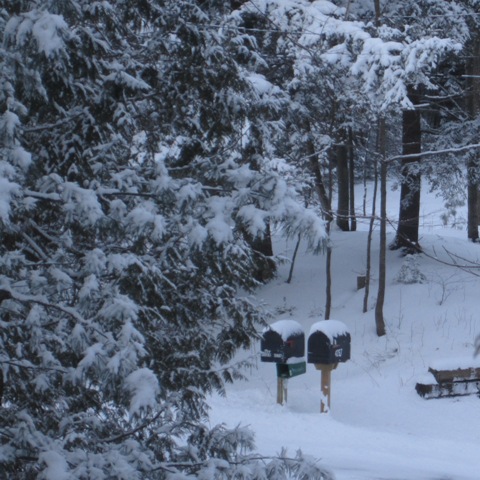 Saturday, 8:30 a.m. And then . . . as I wrote all that blather, the sun peeked over the drumlins. Things brightened up considerably. I stepped out to the deck to take a picture of the empty green tube by the mailbox, and look! A speck of white!