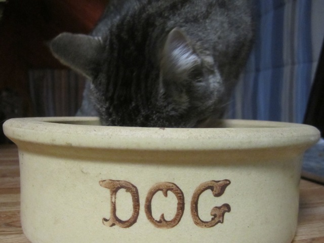 Miss Puss eating from the Cowboy’s dish is probably not really an issue for philologists, but it seemed apt anyway. That’s just how my brain is wired.