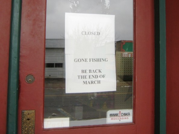 There is a cheerful “Gone Fishing” sign, and word around town is that yes, what we have here is a vacation, not a closure. Still, storefronts on both sides have For Rent signs in the windows. Rocket Rob’s Pizza across the street is closed for good. So is the corner bar, and Tia’s Restaurant. I did not have the heart to take all those pictures.
