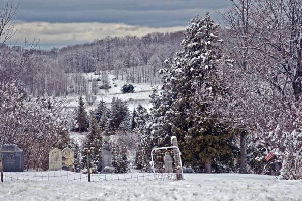 It was bound to happen sooner or later. She’s always liked their barns and their silos. Now she’s stopping to take a picture of the old Catholic Cemetery in Atwood. Those wily Civil War veterans have captured Babs Young. She writes, We had a nice snow yesterday. It was wet and stuck to everything. So we are all white once again.