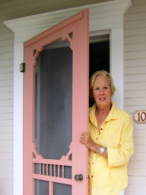 Remember the gingerbread house with its cunning pink screen door?  Today you are invited to step through that door.  This is Patti Findlay, our hostess.  She bought the house when it had Seen Better Days and turned it into the confection known as The Pink Lady.  One might say that the house is now seeing its Very Best Days.