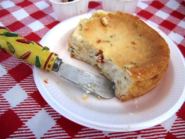 There I was, trotting along through the Elk Rapids Farmers Market, shopping bag bulging with perfect little red potatoes from Wells Family Farm, tomatoes and corn and peppers and cucumbers and eggplant from Altonens, when Beverly Fields’s booth stopped me in my tracks. Savory cheesecake. Three kinds. Oh mercy. This four-inch beauty, if memory serves, is the chipotle roasted pepper version. As memory often fails to serve, it might just as well be the Egyptian basil and sundried tomato version. It is not the olive and walnuts version because that looks different. I had to tell you about these before I forgot where I sampled them, because you would never forgive me if I knew about something like this and failed to mention it. The Fields family thrives in Kalkaska. You can find them at the Elk Rapids Farmers Market on Friday mornings, and you can call them at (231) 384-5944 to place special orders.