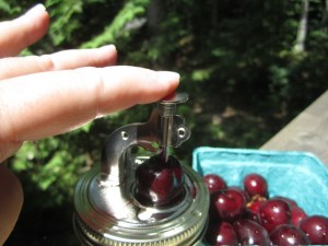 I stopped off at Kings on my way home and bought one. I thought you’d like to see it in action. It is a marvel of simplicity. Screw the pitter onto the top of a nice clean empty little jam jar. (I have lots of these–let me know if you need one.) Place the cherry in the clever little indentation.