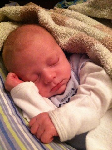 Chris and Sonny are off at the other end of I-75, unaccountably managing to have fun entirely without us.  She writes: while we are here in Florida, I was reading your blog.  [Well I should hope so–if I didn’t have a loyal following of snowbirds no one would want to look at my pictures of snowpiles.]   I have a cute shot of our new grandson Evan.  And she did, too.  Looky here: