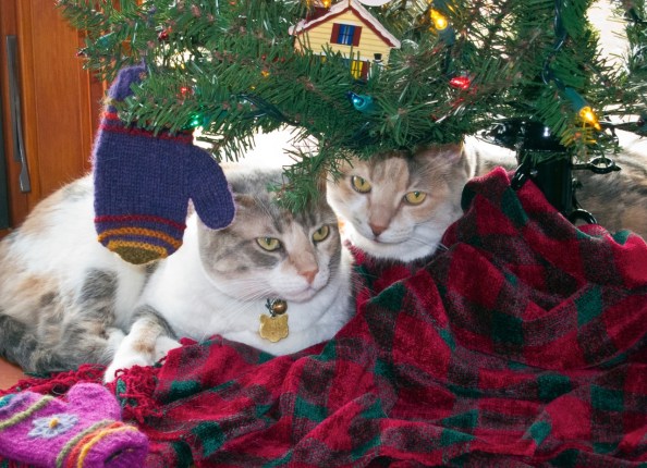 Happy New Year!! I had hoped for a really spectacular snow picture today. We are in the middle of a Blizzard Warning, but so far it’s just blown and rained and snowed some, but didn’t stick much. It’s now colder and we may have a foot on the ground by morning, but that didn’t help me much. So here are our two kitties, Hecate and Selene keeping warm under the tree. I hope all your wishes come true in the new year.
