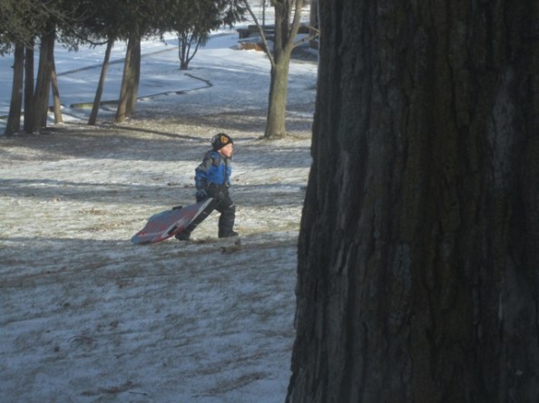 So it is an odd sort of winter, but the little kids don’t care.  They’re having a good time sliding on half an inch of snow.  Four books demanded to come home with me from the library.  Who knows where that will lead.  And Miss Sadie and the Cowboy assure me that it’s perfectly good walking weather.   We’re going to go see whether they’re right.