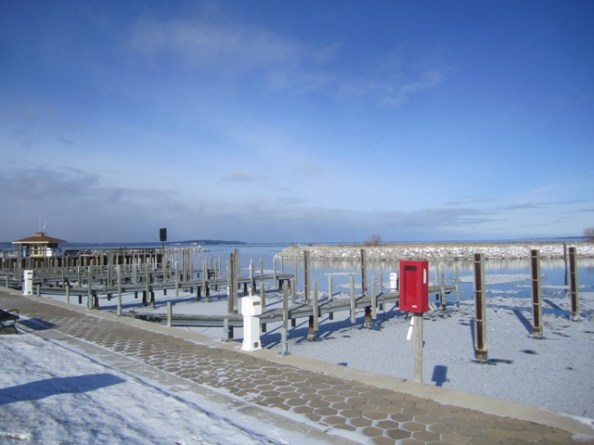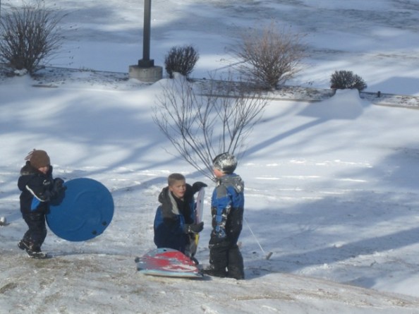January 1.  Rain.  Rain.  Three fat snowflakes flying sideways.  Wind.  Wind.  January 2.  Snowdust on the deck.  More wind.  Lots of snow somewhere last night, but not here.  I didn’t even bother to sweep off the deck and the steps this morning before trotting across the road for the paper.  No real snow but lots of real cold.  Grouse, grouse.  Off to the Elk Rapids Library.  Grouse just once – can’t stay cranky sitting on that porch.  Glance out the windows and see a gladsome thing.  Kids sliding down the library hill.