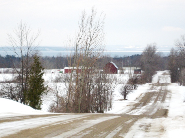 Tuesday morning I headed down to the south end of the Township and followed the 45th Parallel out Coleman Road to a Centennial Farm. I did not take a single picture, but I have some from the archive. This is what Coleman Road looked like in March, 2008. There was more snow on it Tuesday. Other than that, it hasn’t changed much. Nice view of the Bay.