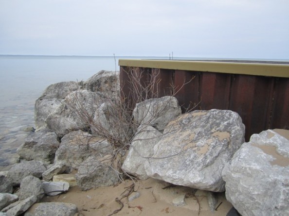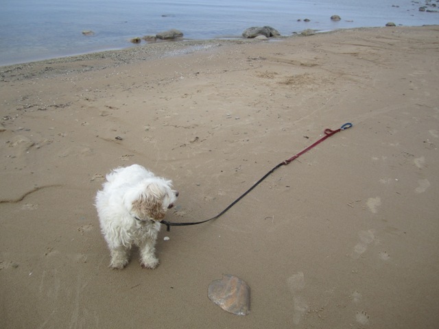 The warm weather held through Saturday, and it was a great relief to go down to the beach with the dogs and stop thinking about Stuff for awhile. We walked a long way. Miss Sadie did some spin-dancing, the Cowboy did some rolling, I inspected. Lake, check. Sand, check. Rocks, check. The Leelanau Peninsula is stretched out along the distant horizon, just as it is supposed to be. So far so good.