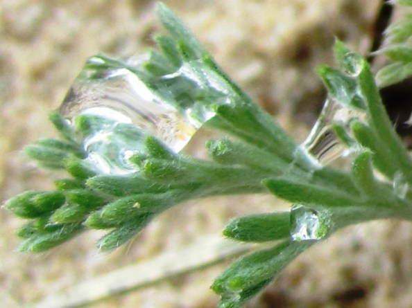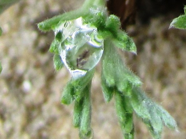 An interesting little plant that I haven’t identified is thriving down there. Upon close inspection, I saw that it has hairy little leaves and stems, and seems to exude a clear sap that might attract insects. Dunno whether the plant is looking for collaborators in the reproduction process or for food. Life is complex that way, isn’t it? You never know whether a dinner invitation means that you will eat well or be the entree. Anyway, take a look, see what you think, tell me what you know or guess. (Those glassy blobs are definitely sticky, not raindrops.)