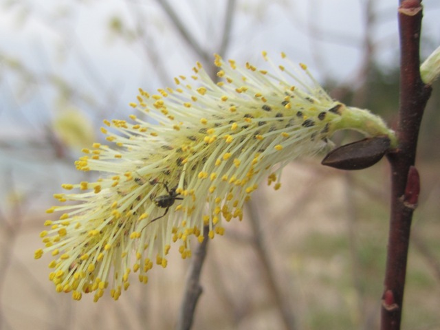 The pussy willows were in full bloom, a little disheveled by the rainstorm of Friday night but apparently full of enticements for the tiniest beach dwellers.