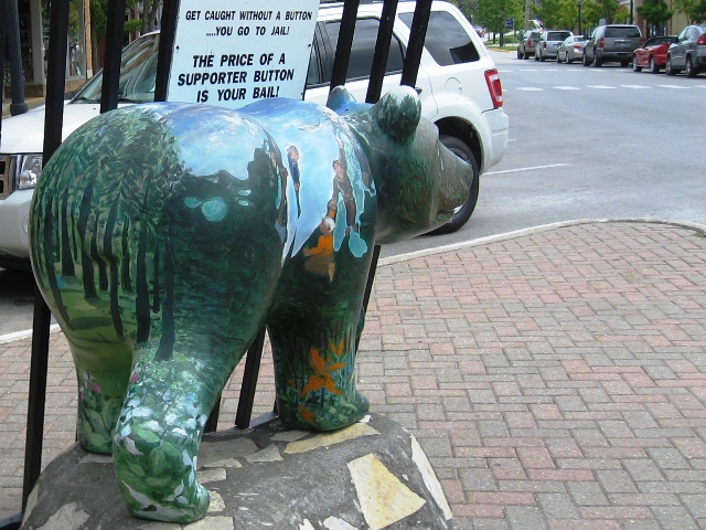 Your bear is wonderful! Does it get clear-coated every year, or something, to help protect against the effects of sitting children, weather and such? It must – it looks very good for having been around a few years. I especially like the association with the book and local history. Our pelicans are painted, too, but with local flora and fauna more than history.