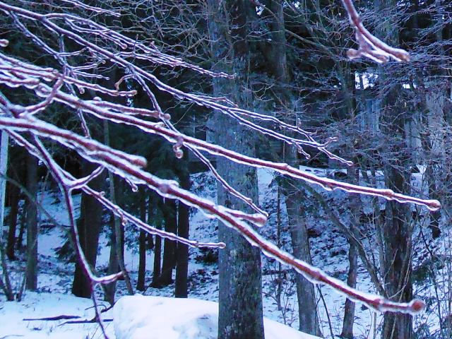 The rest of the week featured snow, sleet, slush, more rain, ice–all of it landing on us like the biblical plagues on Egypt. Early Friday morning Miss Sadie, the Cowboy and I went out for the newspaper and a bit of ice skating. The mailbox was frozen shut, the car doors were frozen shut, and the trees clicked and pinged gently in the breeze as if they were made of glass.