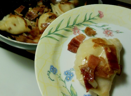 I promptly presented myself with sparkly clean hands and face, carrying a monkey, but that’s another post entirely, and . . . TA-DAH! Grandma’s Perogies from the Eastport Market, sauteed to mouthwatering perfection with some of the Market’s own smoked bacon. Great minds, great minds.