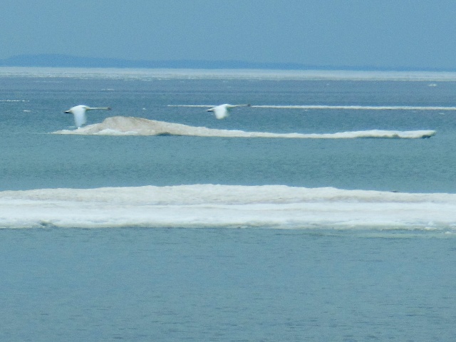 Miss Sadie, the Cowboy and I have been down on the beach documenting the arrival of springiness based on the departure of iciness. The ice mountains, broken loose from the shore ice, have begun to float away. The open water is encouraging birds. I am pretty sure these are migrating Tundra Swans, headed north up the Bay. (I got a better look at them than the camera did, on account of my grip is wobbly and my reaction time is pathetic. Anyway, all white except for black legs and black bills (no yellow/orange – not mute swans) at the end of long straight necks–and really big. Enormous.)