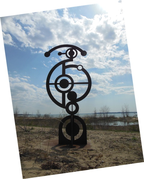 After all that, we went back to the Writing Studio and Bait Shop where we introduced Katie to Miss Sadie and the Cowboy. The Duo gave her a rowdy welcome, which surprised her very much. Katie is accustomed to dogs who have passed obedience school. Miss Sadie and the Cowboy are accustomed to . . . each other and to me. None of us have passed obedience school. We hope to make a better impression in future. Katie has gone home now, but you can see the same sculptures she saw at the Walk of Art, including Timekeeper, by Maureen Gray. (It is on a funny angle because I was lying on my back on the beach trying to make a dramatic image. I should stick to words.)