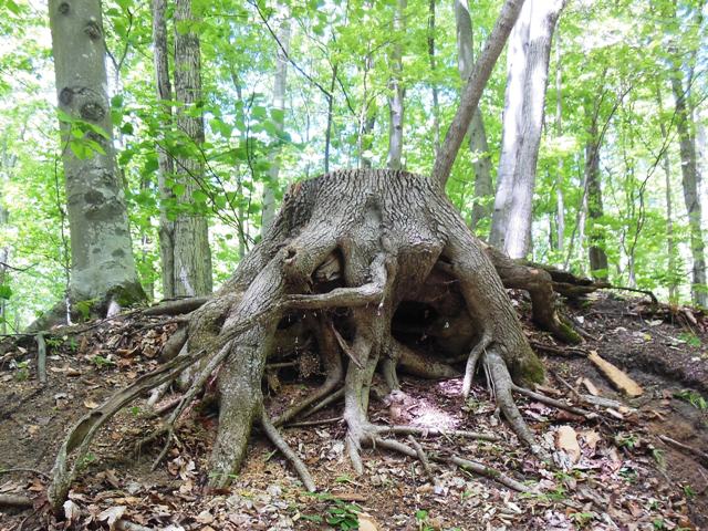 I leave you with one last vision of our northern woods. Bruce Bigelow has been removing dead and dying trees in the neighborhood because (1) they have been threatening to fall down on our valuable persons and (2) they are potentially good firewood and after last winter firewood is much on everyone’s mind. The roots are left to keep all our Critical Dunes (aka sandy hills) from sliding into the Bay. As a result, one of my favorite Hoo-doo Trees has devolved from a woodpecker condo complex to a Stump Creature.