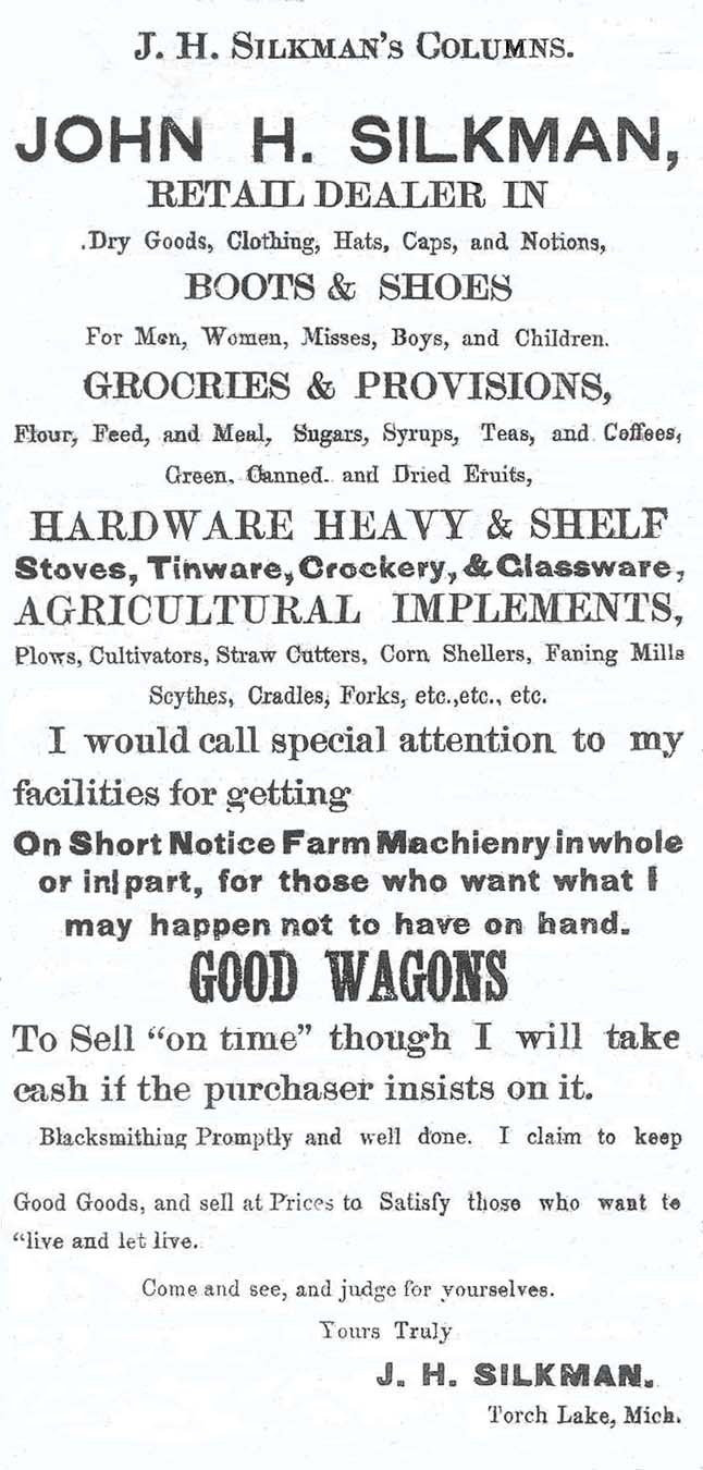 John owned most of three sections of land, a hotel, a fleet of schooners, and a summer home on Torch Lake. He owned a tug and passenger steamer named the Jennie Silkman after his wife, Rachel Jane. He owned the Company Store.
