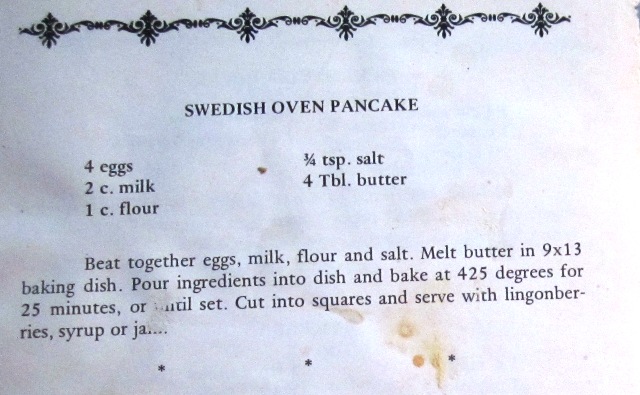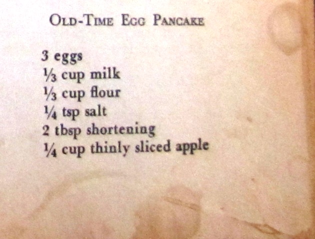 Swedish Egg Pancakes are my adaptation of two well-loved recipes (reproduced at the bottom of the page) that were thoroughly tested at our house.  As you can see,  the cookbook pages are fairly disreputable at this point!  I am reliably–even indignantly–informed that these are Finnish Pannu Kakku, or German apple pancakes, or . . . lots of people claim them.  If you try them, you’ll see why.  They are very good for brunch, or for lunch, or for supper–and you can name them anything you like.
